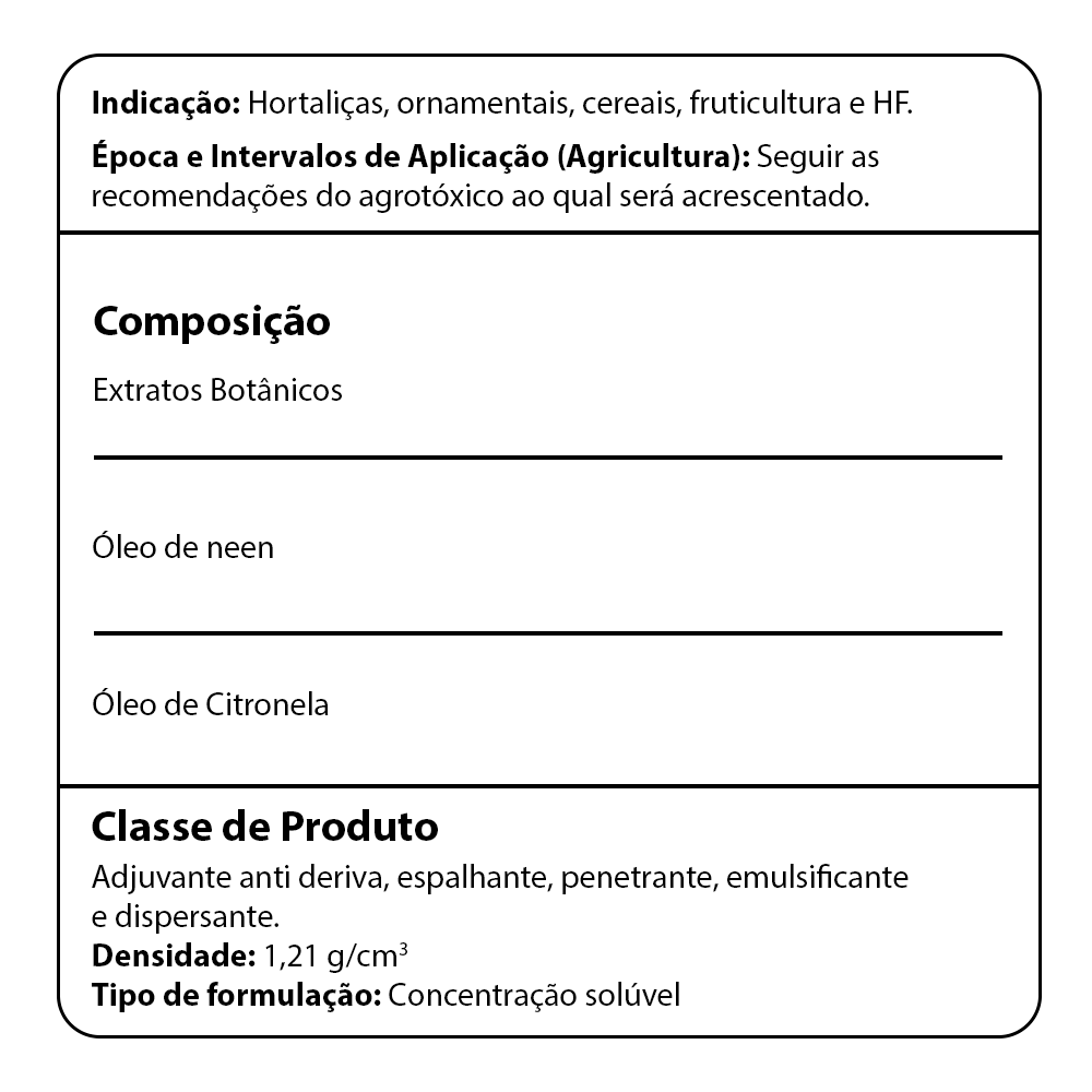 Descrição Características Vídeo Uma solução inovadora projetada para maximizar a eficiência no controle de ácaros em lavouras. Formulado com extratos botânicos e enzimas metabólicas e tecnologia de ponta, melhora a absorção e translocação de moléculas, aumentando a eficácia dos produtos aplicados. Ideal para garantir resultados consistentes, plantas mais resistentes e um manejo agrícola de alto desempenho. Benefícios: Potencialização do Acaricida: Aumenta a eficácia do controle ao otimizar a absorção e a ação do produto. Versatilidade na Aplicação: Indicado para aplicação via folha, com resultados visíveis em ciclos regulares. Fórmula Natural: Desenvolvido com extratos botânicos, enzimas metabólicas e ingredientes seguros para o meio ambiente. Aplicação: Misture o produto em água em conjunto com adjuvante e aplique via folha. Formulação: Doses maiores e mais concentradas, formuladas para atender ao manejo de grandes áreas agrícolas. Dosagem: Citrus:1 litros para 2000 litros de água. Fruticulturas em geral: 1 litros para 2000 litros de água. Cereais: 400ml por ha. Hortifruti: 2ml por litro de água. Categorias: Adjuvante Características: Potencializador Características: Ácaros Categorias: Proteção