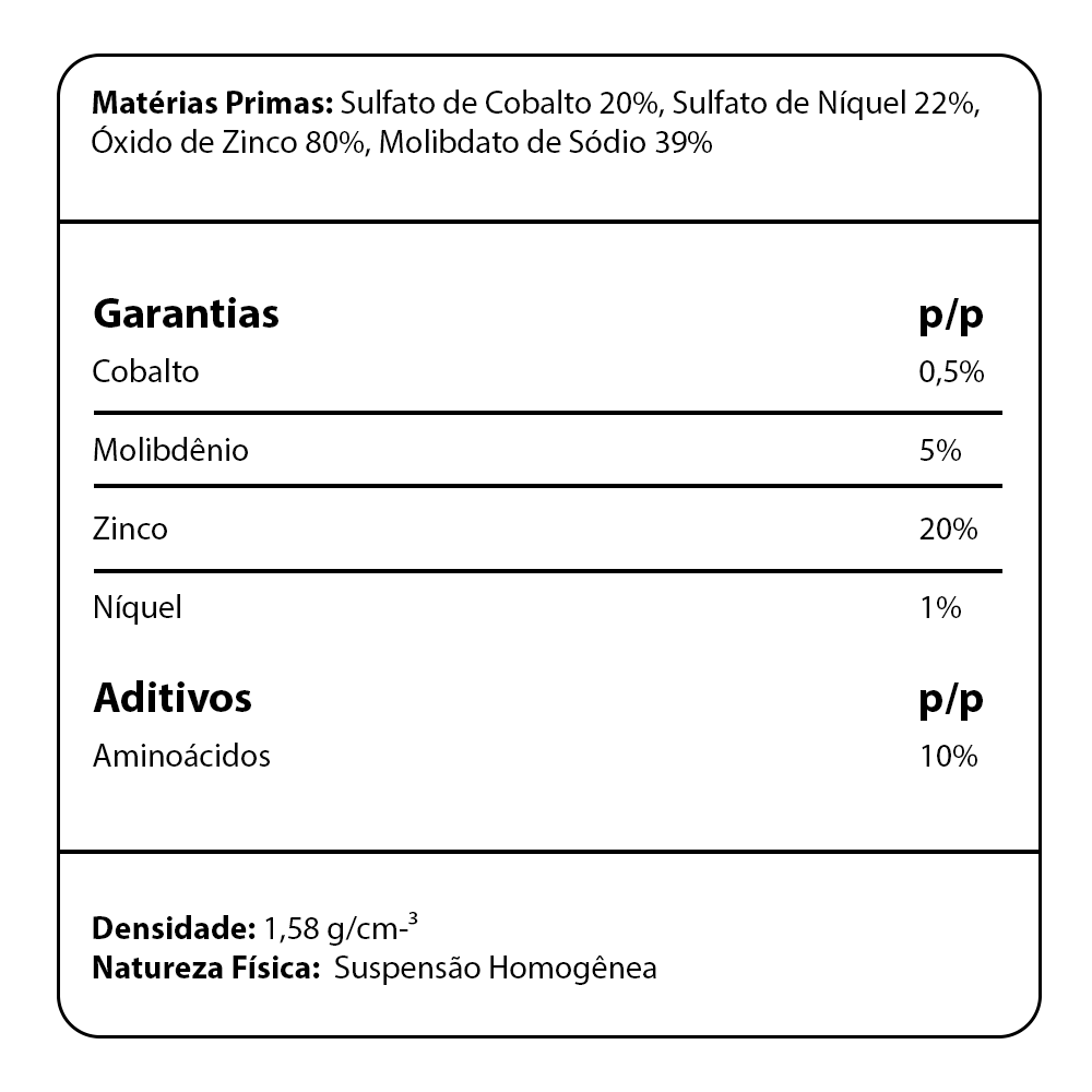 Descrição Características Vídeo Fertilizante Especial desenvolvido à base de Cobalto, Molibdênio, Níquel e Zinco, indicado para tratamento de sementes e pulverização foliar. Proporciona suporte essencial para o desenvolvimento inicial das plantas e melhora a eficiência nutricional. Indicação: Citrus, Hortaliça, Fruticultura em geral, Cana-de-Açúcar, Cereais, Café e Ornamental. Aplicação: Via Foliar. Dosagem: Soja, milho, sorgo, trigo, arroz e feijão: 100 – 250 ml/ha. Cana-de-açúcar: 300 ml/ha. Frutíferas e café: 250 – 300 ml/ha. Hortaliças: 100 - 250ml por ha. Categorias: Fertilizante Foliar Características: Fixação de Nitrogênio Características: Produtividade Características: Sementes